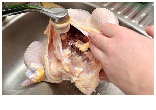 Rửa gà cùng nước và gừng tươi để khử mùi hôi. Bỏ hết phần nội tạng trong bụng gà.