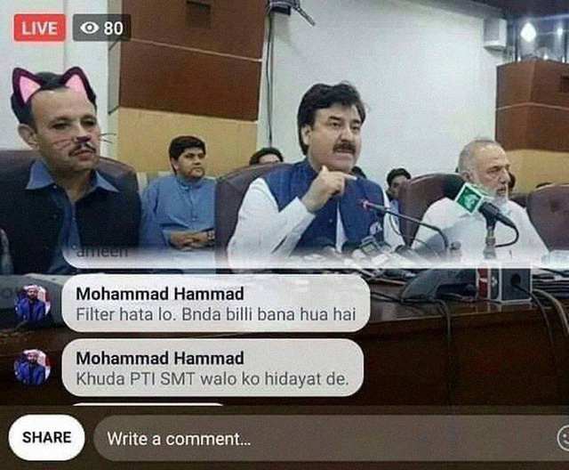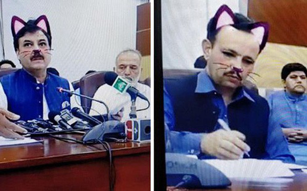Một sự cố hi hữu và hài hước đã xảy ra trong cuộc họp báo của chính quyền tỉnh Khyber Pakhtunkhwa, Pakistan. Người chịu trách nhiệm live-stream đã quên tắt filter mèo hồng cute. Vì vậy mà một vài chính trị gia có má hồng, mọc ra tai nhọn và ria mèo.
