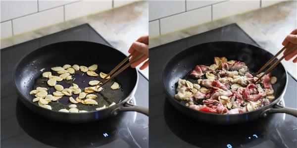 Cho một ít dầu ăn vào chảo, thêm tỏi băm vào chiên thơm trong khoảng 2 phút. Đổ thịt bò vào xào cho đến khi thịt chuyển màu.
