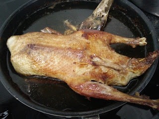 Bước 2: Sau 15 phút, chiên vịt vàng lớp da bên ngoài, lưu ý khi chiên bạn vặn lửa nhỏ để tránh vịt bị chín quá kỹ.
