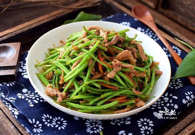 Rau củ tùy chọn, bào thành sợi nhỏ, thịt heo cắt miếng nhỏ, ướp gia vị để sẵn. Phi thơm hành tỏi, cho thịt heo vào xào chín trước, cho rau củ vào xào sau, nêm lại gia vị, rắc thêm chút hành lá và dọn ra đĩa.