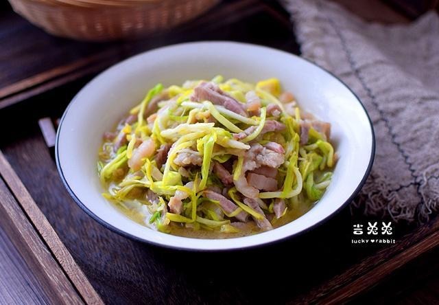 Thịt xông khói ngâm nước nóng để làm mềm rồi cắt thành từng miếng nhỏ, bắp cải thái mỏng. Phi thơm hành tím, cho thịt vào xào trước, cho bắp cải xào sau, nêm gia vị luôn lúc này, không nên xào quá lâu bắp cải sẽ chín nhừ, mất ngon.