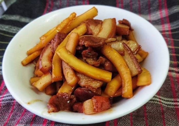 Dừa đã nạo vỏ, thái miếng dài cỡ 7cm, mỏng, thịt ba chỉ thái miếng như khi rang c*h_á_y cạnh, ướp thịt với 2 thìa nước mắm ngon, nửa thìa đường, 2 thìa nước màu, nửa thìa bột nêm, 2 củ hành khô băm nhỏ cả vỏ, ướp vào một tô hoặc nồi, để tầm 30 phút cho ngấm gia vị.