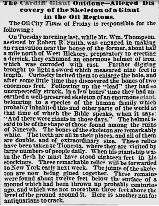Năm 1870, một bài báo đề cập đến việc phát hiện xương người khổng lồ xứ Oil đã xuất hiện trên tờ Oil City Times. Cụ thể, người ta đã tìm thấy một thi thể kỳ lạ bên dưới lớp áo giáp khổng lồ với bộ xương có chiều cao đáng kinh ngạc: