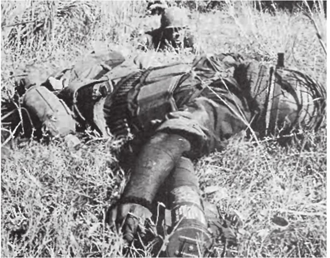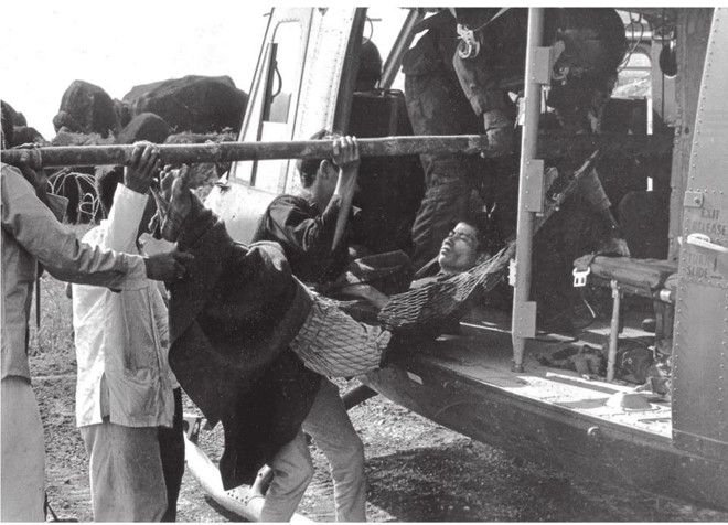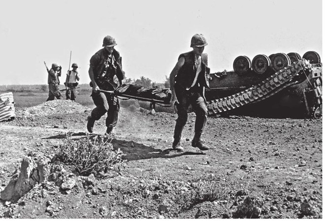 Hai lính Mỹ đưa đồng đội ra trực thăng sơ tán y tế. Đằng sau họ là xe bọc thép chở lính bị lật ngược. Chính phủ Mỹ muốn ghi lại cuộc chiến, để tăng ủng hộ từ quốc nội, phục vụ tuyên truyền về kế hoạch chống chủ nghĩa cộng sản ở Đông Nam Á. Vì vậy các phóng viên ảnh được cho phép tiếp cận và chụp hình mọi nơi họ muốn. Nhưng cuối cùng, những hình ảnh máu me lại khiến công chúng quay lưng lại với chính phủ.