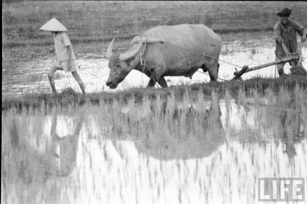 Người nông dân cày ruộng bằng trâu gần nhà thờ Dòng Chúa Cứu Thế Huế.