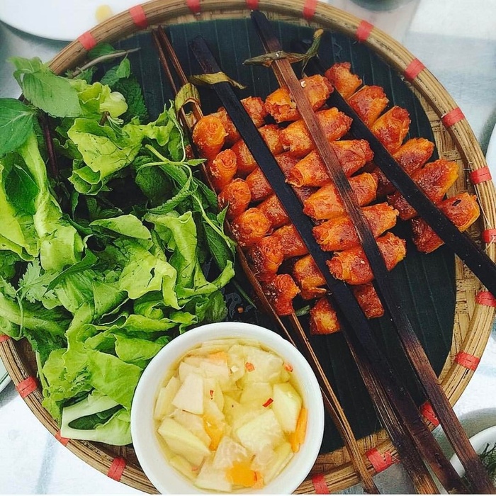 Cuốn chả : Lấy vỏ bánh phở cắt khoảng 2 đốt ngón tay ( chiều rộng khoảng 4cm, dài 8cm). Cho nhân vào cuốn như cuốn phở cuốn.