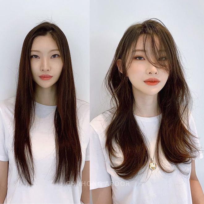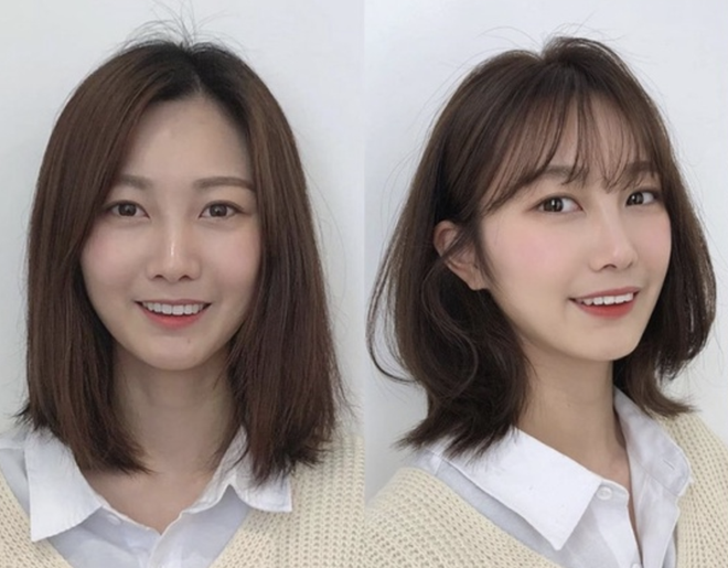 Nhiều nhà tạo mẫu tóc cho rằng tóc ngắn thực sự là "chân ái" của những quý cô gương mặt dài. Tuỳ theo sở thích mà bạn có thể chọn tóc bob ngắn ngang cằm hoặc tóc lob ngang vai. Như Han Ye Seul cũng vừa "hack tuổi", trông baby hơn khi chuyển sang tóc ngắn, kết hợp mái ngố thưa thế này.