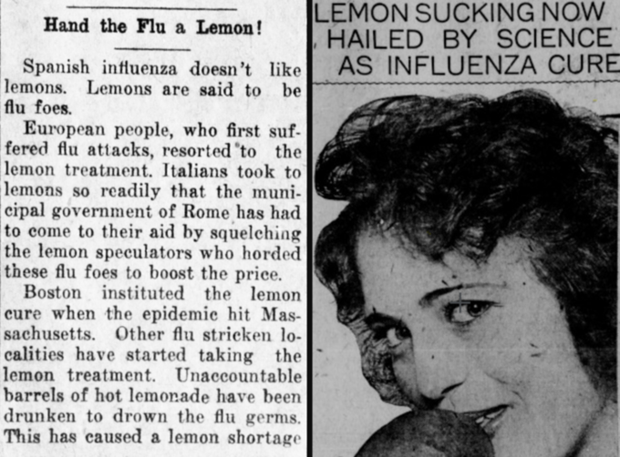 Song trong đại dịch, người ta truyền tai nhau hình thức có phần kỳ quặc, đó là hút nước trực tiếp từ trái chanh. Tháng 10/1918, tờ Los Angeles Herald xuất bản số báo có tiêu đề "Ngậm chanh được khoa học chứng minh là biện pháp chữa cúm", với hình ảnh của phát ngôn viên xinh đẹp Marie Cooney, thuộc Phòng Thương mại Mỹ, trên bìa. Các chuyên gia khẳng định điều này không thể ngăn chặn sự lây lan của virus. Song đây vẫn là cơ hội hiếm có đối với những người nông dân trồng chanh ở California.