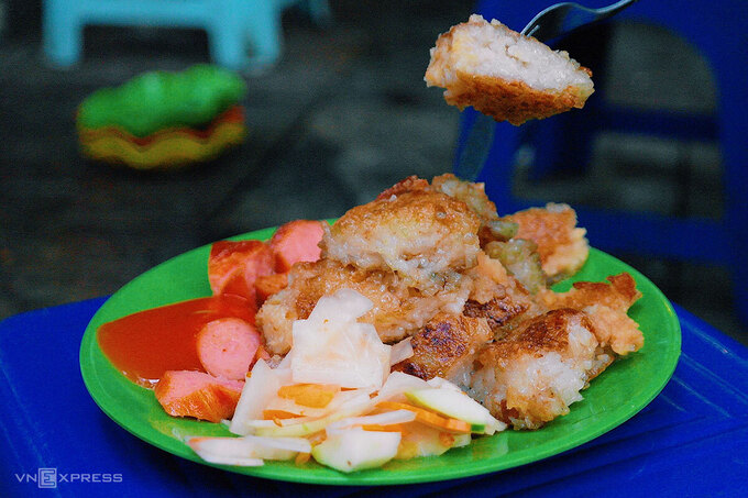 Không biển hiệu, không quán sá cầu kì, chỉ có bếp than hồng và mâm tròn làm chảo. Hàng bánh chưng rán ở góc phố với mấychiếc ghế nhựa con con, đôi khi là chiếc xe đẩy, đôi quang gánh rong ruổi khắp phố phường. Đơn sơ vậy thôi mà hàng bánh chưng rán vỉa hè vẫn khiến cho người qua đường không khỏi xuýt xoa.Nhờ có chảo khổng lồ mà những chiếc bánh chưng nhỏ xinh luôn được giữ ấm trên bếp than hồng. Đôi tay thoăn thoắt cắt nhỏ chiếc bánh vào đĩa cho khách, ăn cùng dưa góp hoặc thêm xúc xích nếu muốn. Cuối cùng cô rưới thêm một ít xì dầu lên trên cho đậm đà. Chiếc bánh cũ được bán đi, cô bán hàng nhanh nhẹn bóc bánh mới vào thế chỗ. Chảo khổng lồ vang âm thanh xèo xèo nho nhỏ.