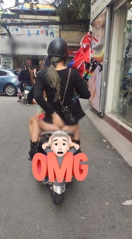 Cụ thể, cô gái này xuống phố đông người nhưng lại lên đồ như thể "không mặc quần", đúng style "trên đông dưới hè". Cũng có thể do chiếc váy của cô quá ngắn nên khi ngồi lên xe máy, đầm bị co lên để lộ cả nội y.