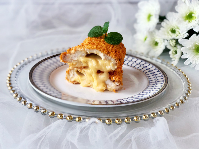 Món gà rán này có lớp vỏ ngoài giòn rụm, bên trong lại mềm ẩm, béo ngậy vị phô mai, tạo nên một hương vị tuyệt vời khi thưởng thức.