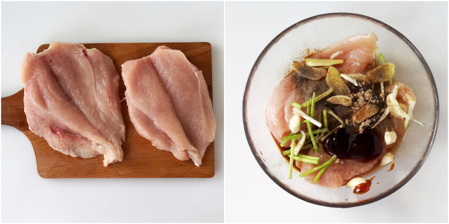 - Bước 2: Cho ức gà vào tô lớn, thêm hành lá, gừng, tỏi, 2 thìa súp rượu nấu ăn, 2 thìa súp nước tương, 2 thìa súp dầu hào, lượng tiêu thích hợp.