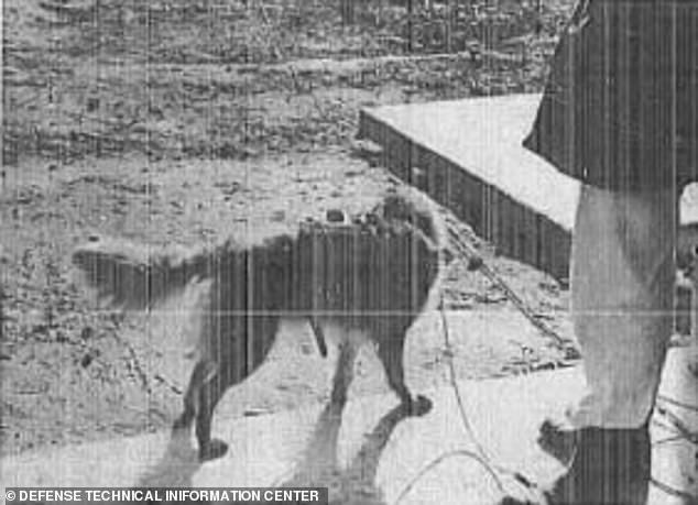 Các bức ảnh đen trắng cho thấy những con chó được đeo một thiết bị kích thích trên lưng và một chiếc mũ bảo vệ nơi các thiết bị được lắp trong hộp sọ của chó.