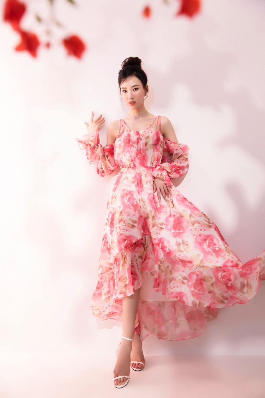 Chất liệu voan cao cấp với hoạ tiết hoa tươi sáng cũng tôn lên vẻ đẹp nữ tính, thanh thoát của cô. NTK Đỗ Long chia sẻ: “Ái Nhi là cô gái bản lĩnh, kiên cường vượt qua khó khăn để theo đuổi đam mê. Sức sống dồi dào của em rất phù hợp với tinh thần ‘Where flowers bloom, so does hope' (ở đâu có hoa tươi, ở đó có hy vọng) của bộ sưu tập lần này".