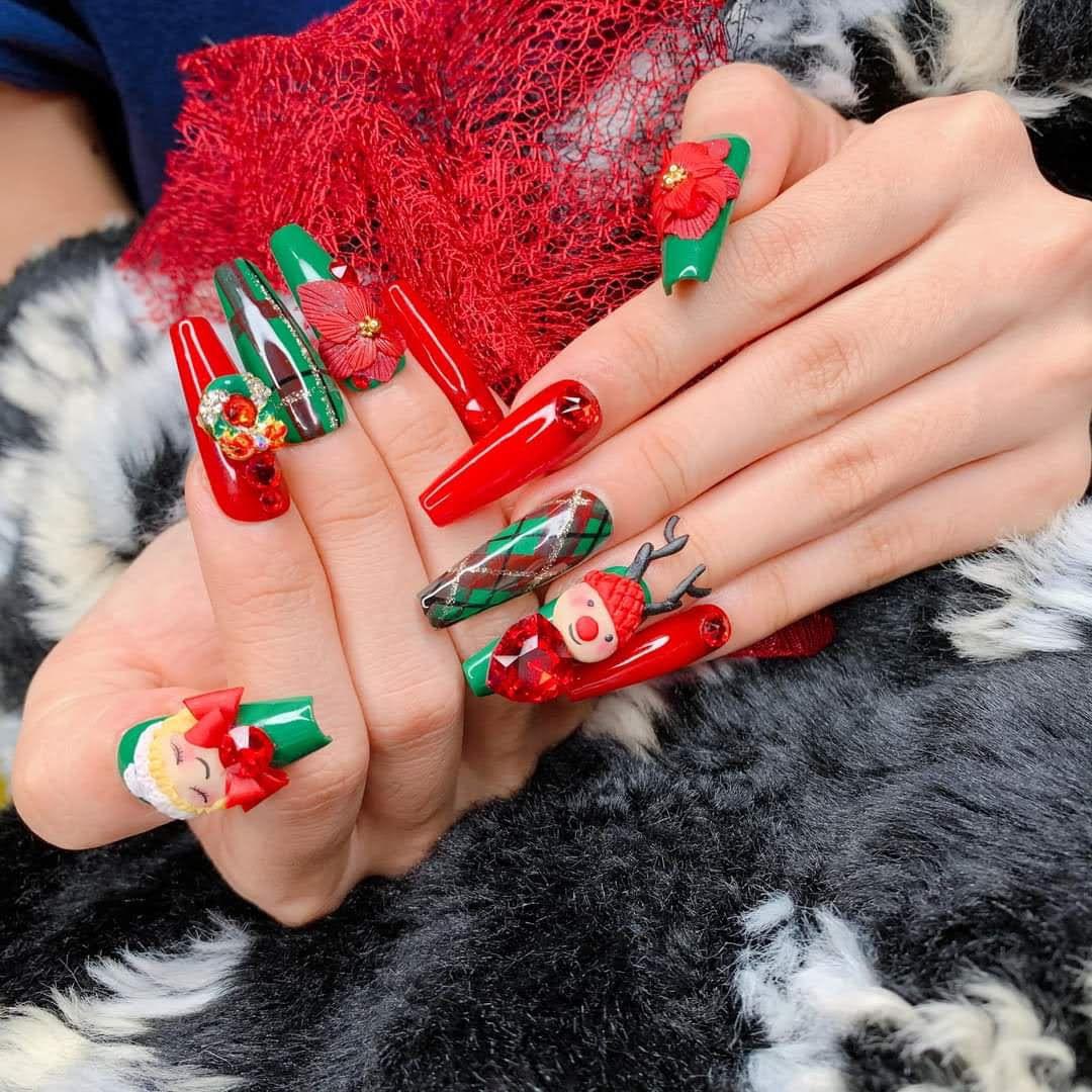 Noel thật sang trọng với tone màu đỏ đô huyền bí kết hợp chút óng ánh kiêu sa. Điểm nhấn của bộ nail này là phần nổi của trái châu, cây kẹo trên nền móng kim tuyến trắng. Diện lên mình chiếc váy đỏ xúng xính chút lớp trang điểm và với bộ nail này sẽ làm bạn thật sự nổi bật.