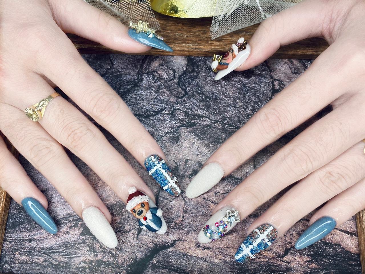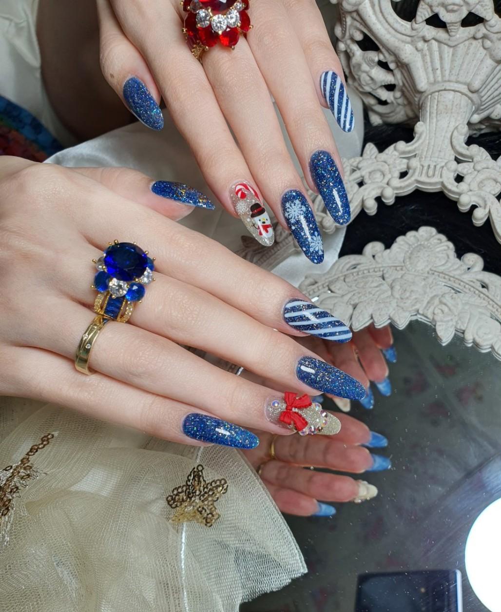 Ngoài tông đỏ quốc dân thì tông xanh cũng không thể thiếu trong đêm Giáng sinh. Với kỹ thuật đắp nổi phối cùng những nhân vật hoạt hình đặc trưng của mùa Noel, đá Swarovski lấp lánh đã tạo nên bộ nail thật ấn tượng và sang chảnh.