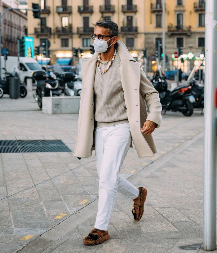 1. Phối phụ kiện mùa hè với trang phục mùa đông: Khi các show thời trang lớn được diễn ra cũng là lúc bên ngoài các tín đồ thời trang thoải mái khoe phong cách. Trong đó, có một tín đồ thời trang nam phối đồ khá lạ mắt. Anh đeo vòng cổ vỏ sò giữa trời đông. Trang phục của anh cũng đều là đồ đông nhưng chiếc vòng nhìn vẫn rất ăn nhập. Ảnh: ACIELLE / STYLE DU MONDE.