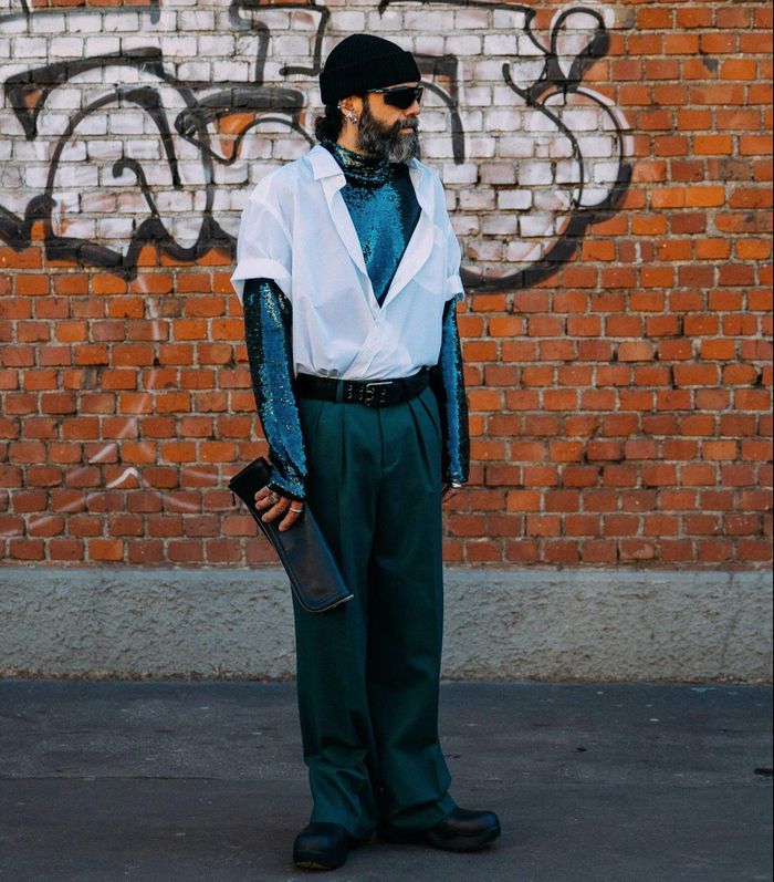 2. Mặc đồ lấp lánh: Nếu muốn thử sức với những trang phục độc lạ hơn, bạn có thể thử phối đồ giống tín đồ thời trang trên ảnh. Anh nhận được sự quan tâm khi phối áo sơ mi trắng đơn giản cùng áo dài tay chất liệu sequin lấp lánh. Ảnh: ACIELLE / STYLE DU MONDE.