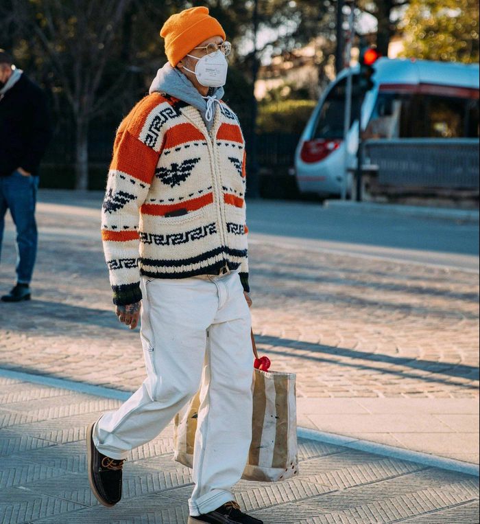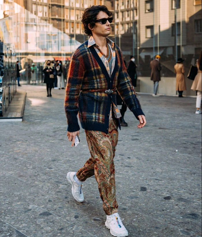 4. Phối cardigan rộng với thắt lưng: Các tín đồ thời trang nam ngày càng táo bạo. Anh chàng trên thành công trong việc thu hút sự chú ý nhờ đeo thắt lưng bên ngoài cardigan. Chi tiết này giúp bộ đồ của anh thêm phần thời thượng và tạo cảm giác vừa vặn. Ảnh: ACIELLE / STYLE DU MONDE.