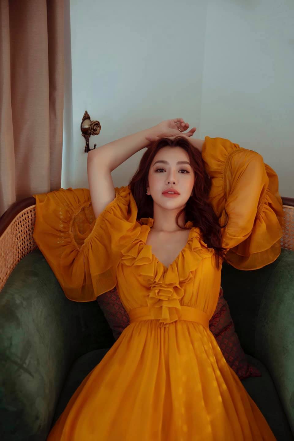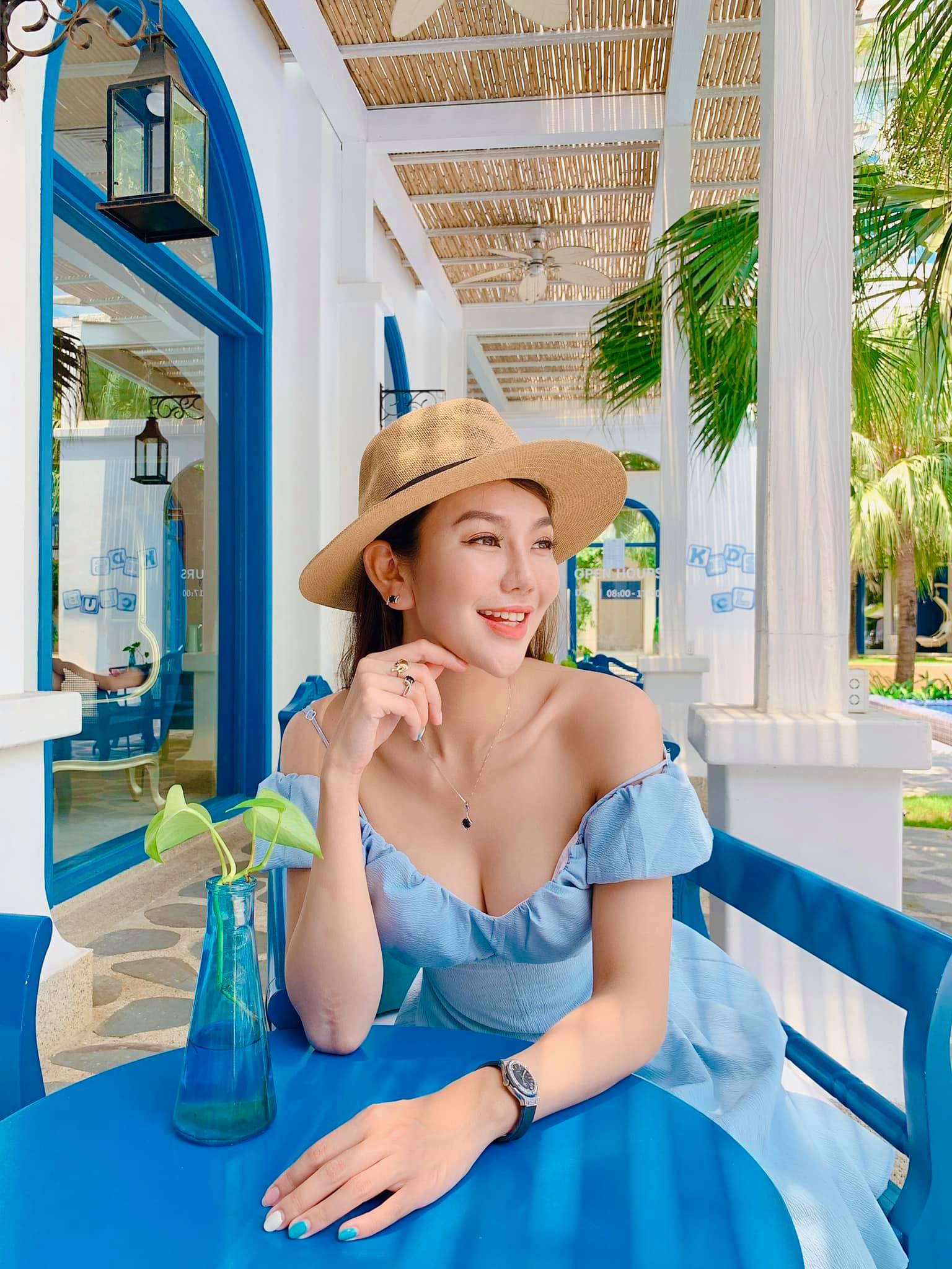 Việc chọn trang phục phù hợp với bối cảnh vô cùng quan trọng. Ở đây, MC Hải Anh diện thiết kế váy trễ vai màu xanh pastel cùng tone với background chụp hình.