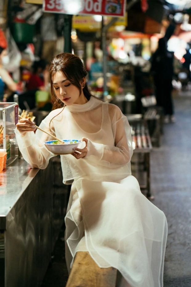 MC Hải Anh diện thiết kế áo dài cách tân được may bằng voan mỏng nhẹ có độ bay.