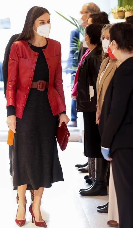Hoàng hậu Letizia mặc lại áo khoác da màu đỏ từng diện hồi năm 2017 khi dự sự kiện về phòng chống ung thư hôm 4/2.