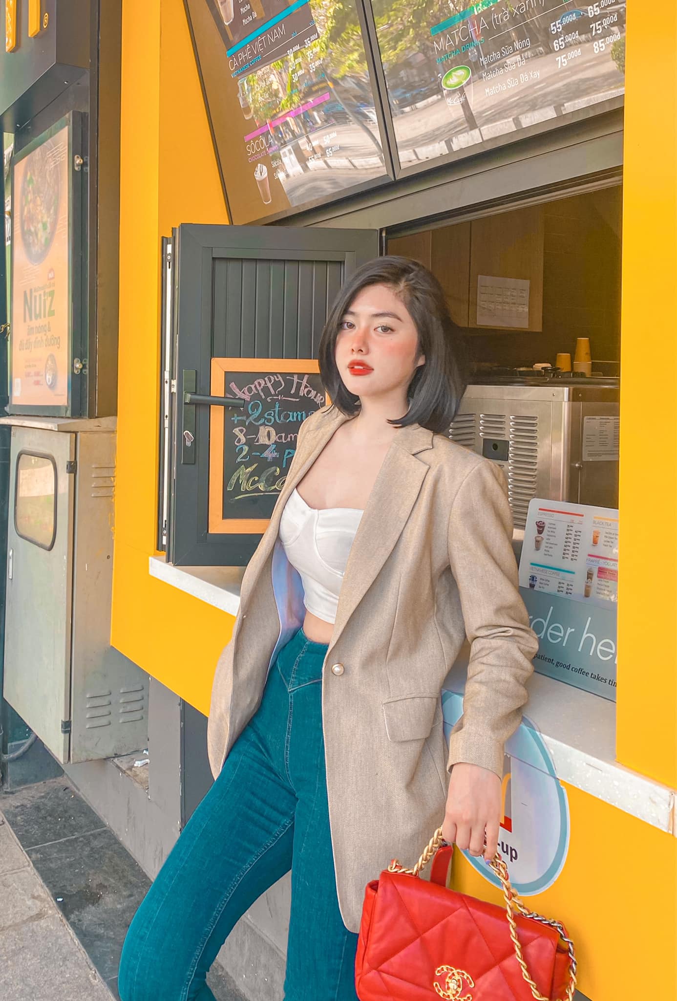 Vẫn là những bộ vest trẻ trung nhưng để gia tăng độ cá tính, Huỳnh Tiên chọn chất liệu denim, boot đế vuông và túi bigsize từ nhà mốt Chanel.