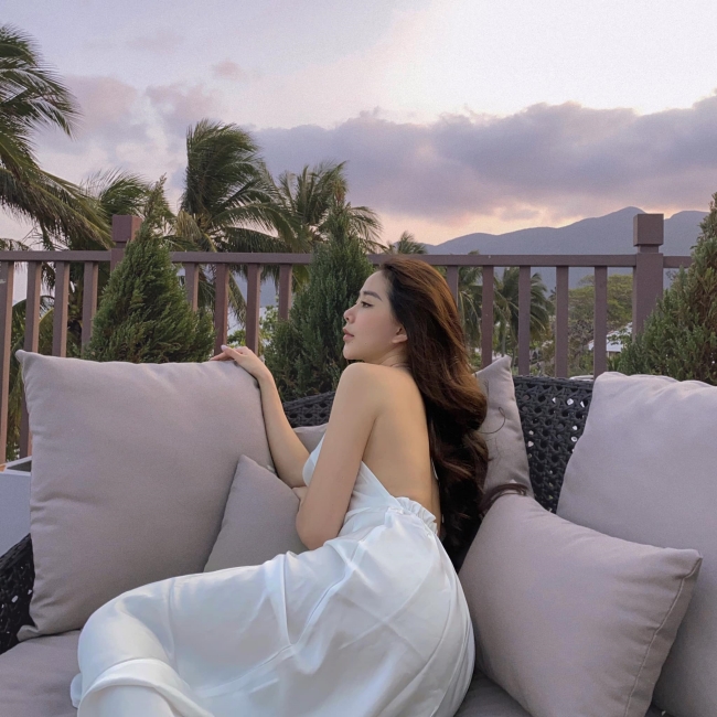 Lục Anh khéo khoe lưng trần với thiết kế váy lụa dáng dài.