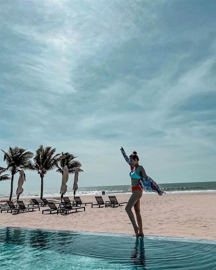 Người đẹp Cẩm Đan khoe trọn vẹn đường cong nóng bỏng với mẫu đồ tắm một mảnh mang tone màu da thanh tao, nhẹ nhàng.
