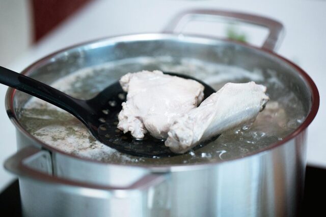 Đun sôi nước trong nồi, cho thịt vịt vào chần qua trong 3 phút, sau đó rửa thịt dưới vòi nước sạch để loại bỏ các tạp chất.