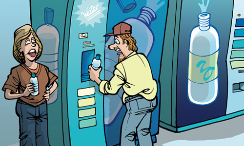 Chàng trai vào một quầy nước tại sân bay để mua chai nước uống.