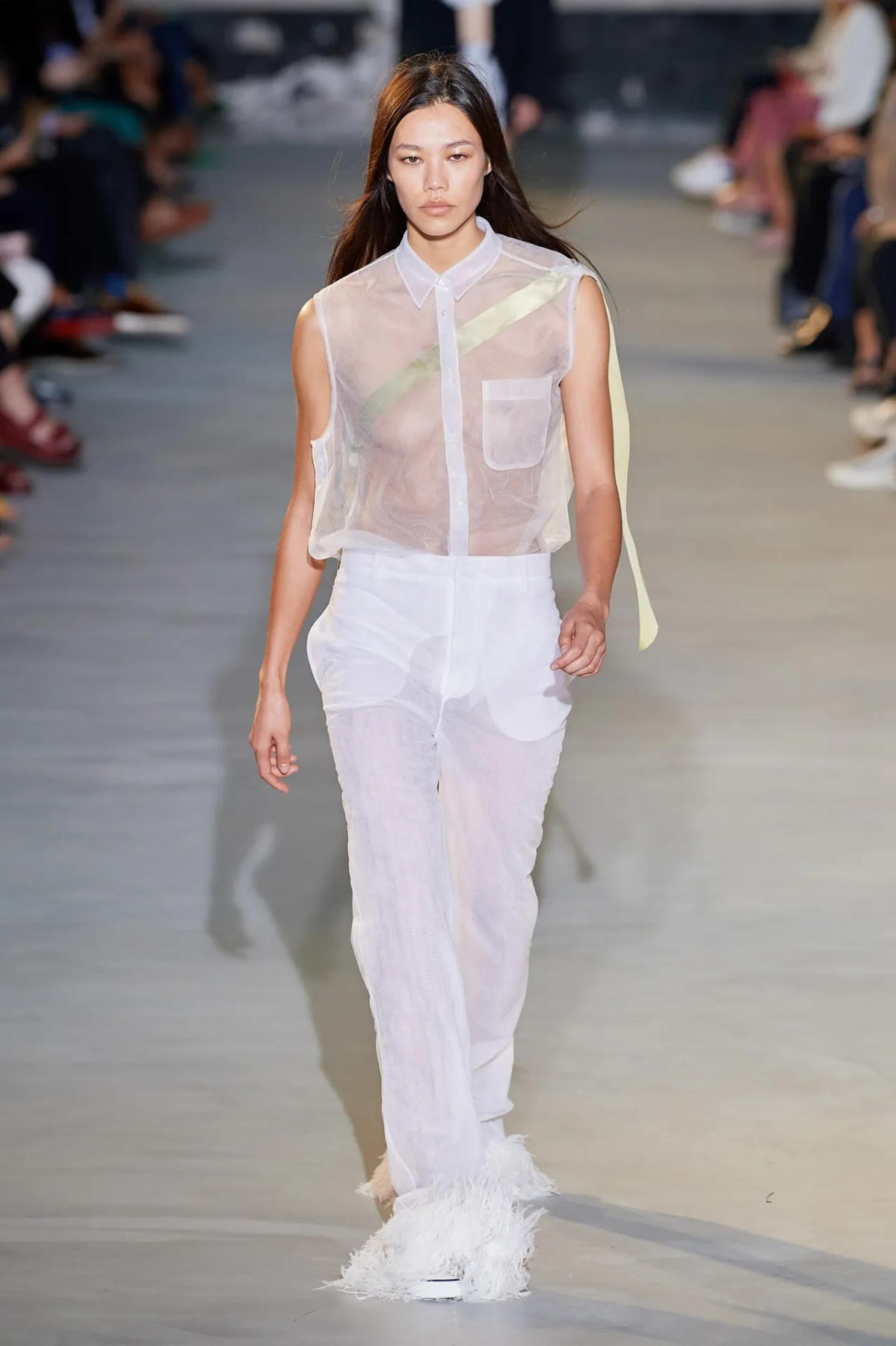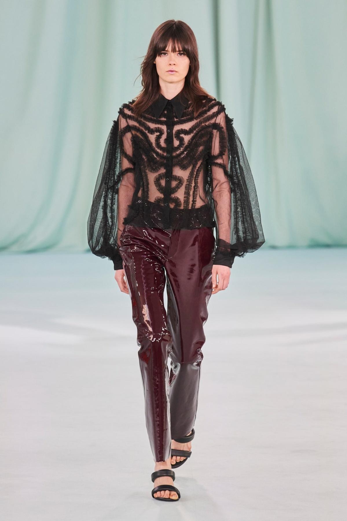 No. 21 lăng xê cả áo và quần xuyên thấu, đính thêm lông vũ tạo điểm nhấn sang trọng. Ảnh: Gorunway
