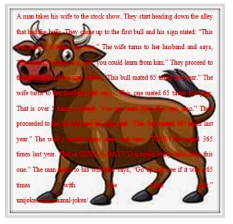 Ông chồng dẫn bà vợ đến gian hàng bán súc vật. Họ cùng nhau đến lô bán bò đực và ở khoang thứ nhất thấy tấm bảng ghi: “Năm ngoái, con bò này thụ tinh được 50 lần” Bà vợ quay sang nói với chồng: “Con bò này làm được 50 cái một năm, ông nên học tập nó”. Họ lại bước đến khoang nhốt con bò đực thứ hai có tấm bảng ghi: “Năm ngoái con bò này thụ tinh được 65 lần”. Bà vợ lại quay sang nói với ông chồng: “Con bò này năm ngoái làm được 65 cái, tức là hơn 5 cái một tháng. Ông có thể học tập nó đấy”.