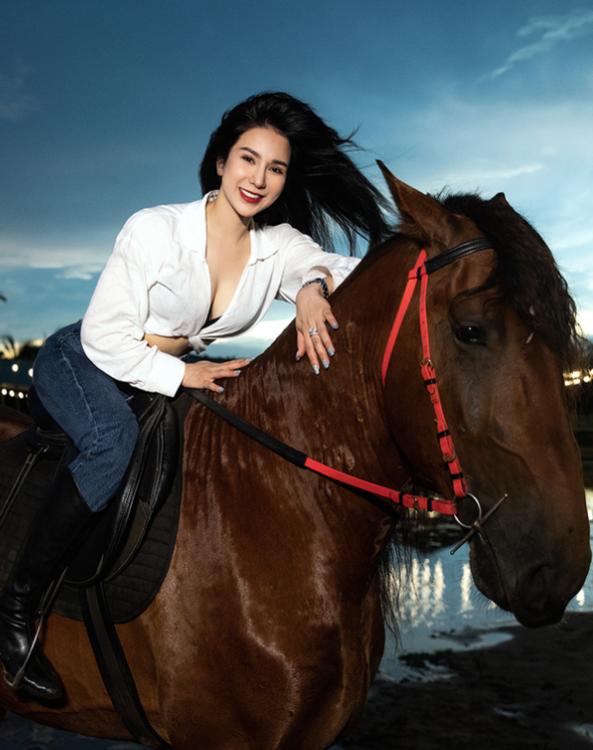 Thúy Ngân khoe vóc dáng nuột nà khi cưỡi ngựa dạo biển.