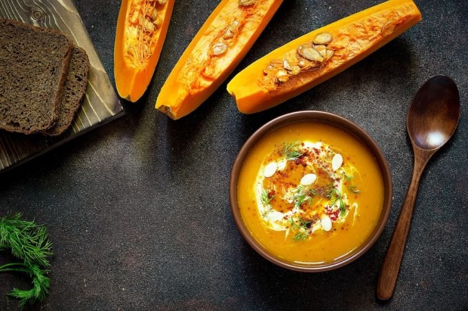 Súp sữa bí đỏ chứa nhiều vitamin A, màu sắc bắt mắt đi kèm hương vị béo bùi, kích thích vị giác. Ảnh: Freepik