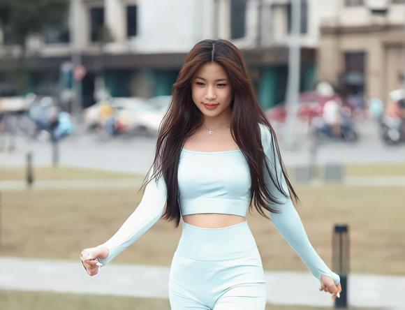 Con gái nữ nhạc sĩ diện trang phục tông xanh thiên thanh bó sát khoe thân hình thon thả tóc xõa bồng bềnh cực quyến rũ.