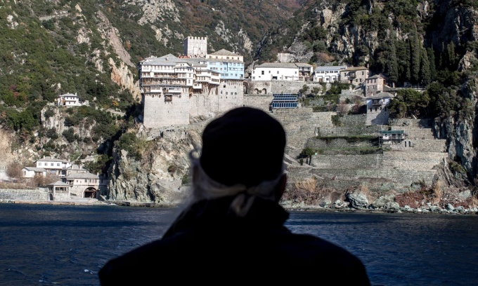 Một tu sĩ đứng trên phà nhìn về phía tu viện Dionysiou, một trong 20 tu viện tại vùng núi Athos, miền bắc Hy Lạp. Ảnh: Guardian
