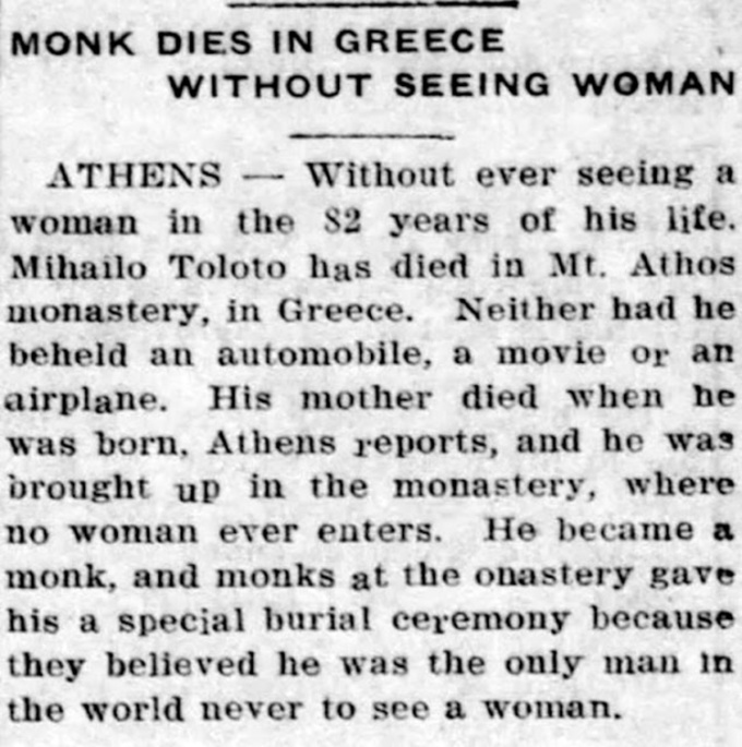Tu sĩ chưa từng gặp phụ nữ trong đời. u sĩ Mihailo Tolotos ở Hy Lạp đã sống toàn bộ 82 năm cuộc đời ở vùng núi Athos, nơi có quy định cấm phụ nữ.