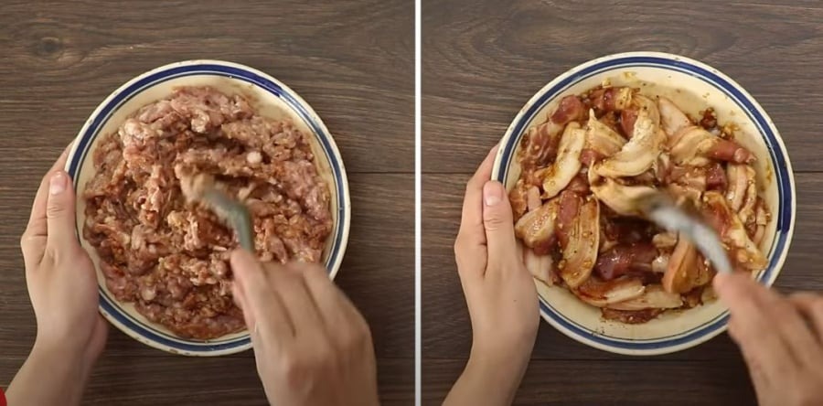 Thịt sẽ được ướp với các loại gia vị trên trong ít nhất 30 phút cho ngấm gia vị.