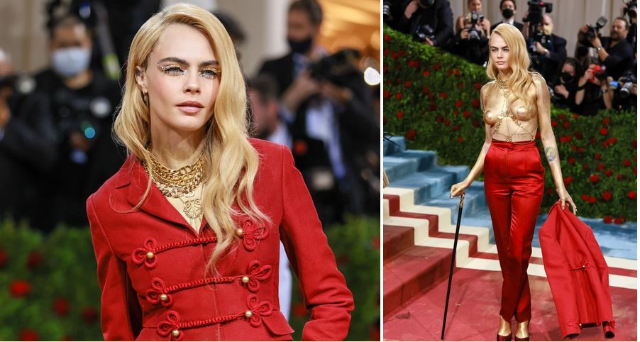 Siêu mẫu Cara Delevingne chấp nhận rủi ro bị chỉ trích khi cởi áo khoe phần thân trên được phủ bằng sơn màu đồng, sử dụng miếng dán để che phần nhạy cảm. So với những lần trước, đây là lần chân dài Anh đưa ra chọn lựa táo bạo nhất, nhưng cũng bị nhiều tờ báo xếp vào danh sách sao mặc thảm họa. Ảnh: Allure.