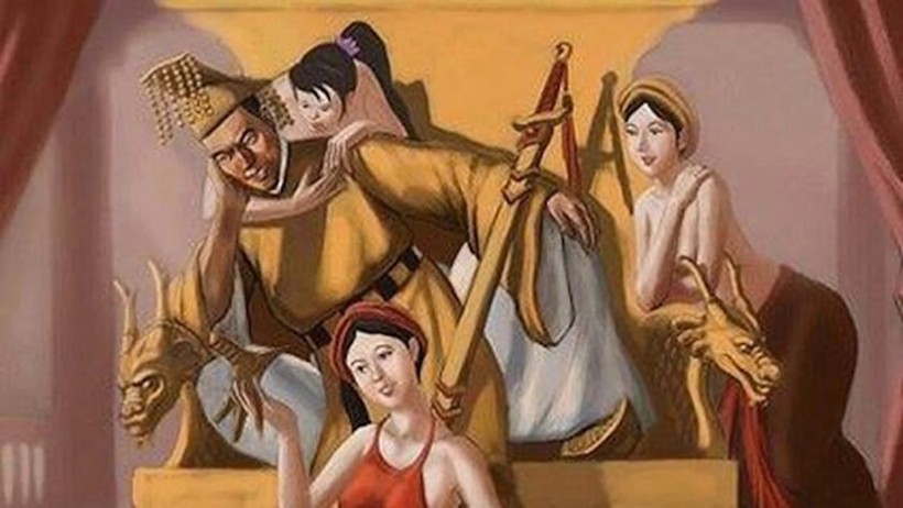 Tranh minh họa vua Trần Dụ Tông đi chơi bị trộm mất ấn tín và gươm báu.
