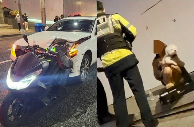 Hiện trường vụ tai nạn, nữ DJ Yesong ngồi ôm thú cưng và không hợp tác với cảnh sát. Ảnh: Chosun.