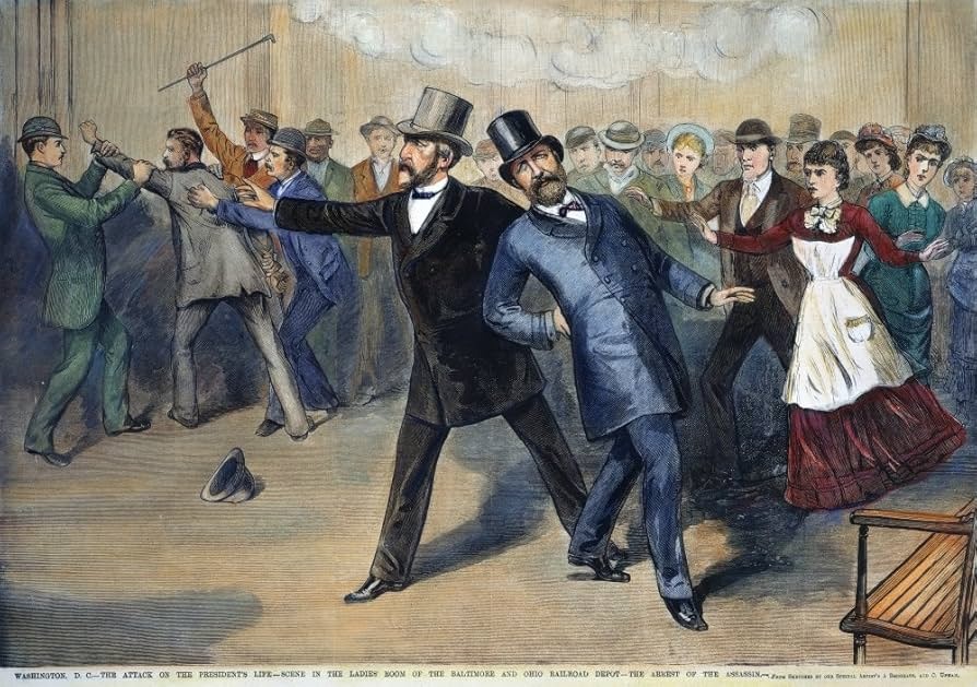 Chưa đầy bốn tháng sau khi nhậm chức, Tổng thống James Garfield bị Charles Guiteau bắn tại một nhà ga xe lửa ở Washington DC vào ngày 2 tháng 7 năm 1881. Tổng thống Garfield bị trúng hai phát đạn, một vào lưng và một viên đạn khác xuyên qua lưng ông. Ba tháng sau, do điều trị y tế không đúng cách, Garfield chết vì những vết thương mà ông phải chịu trong vụ ám sát vào ngày 19 tháng 9 năm 1881.