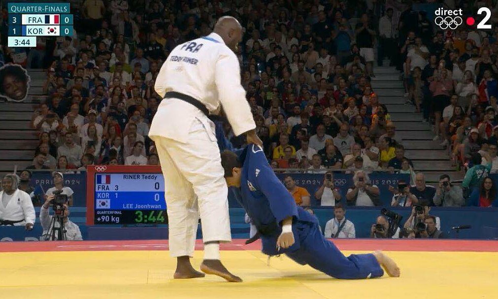 Võ sĩ judo chủ nhà nặng 140 kg Teddy Riner hạ đối thủ Hàn Quốc Lee Joon-hwan chỉ 83 kg, với cảnh xách cổ áo gây sốt ở Olympic 2024.