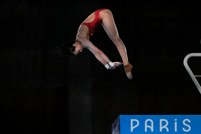 Quan Hongchan được cả bảy trọng tài chấm điểm tuyệt đối ở lần nhảy đầu tiên trong phần thi chung kết cầu đơn 10m nữ Olympic 2024.