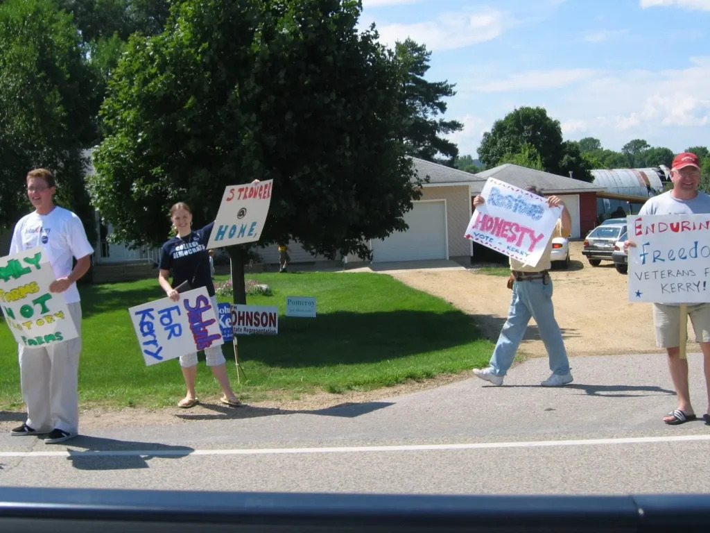 Bức ảnh do Michael B. Brodkorb chụp, được chụp vào ngày 4 tháng 8 năm 2004, khi Walz biểu tình bên ngoài một cuộc biểu tình vận động tranh cử cho Tổng thống Bush ở Mankato, Minnesota.