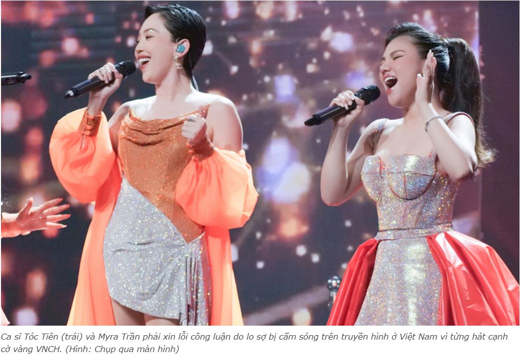 Ca sĩ Tóc Tiên (trái) và Myra Trần phải xin lỗi công luận do lo sợ bị cấm sóng trên truyền hình ở Việt Nam vì từng hát cạnh cờ vàng VNCH. (Hình: Chụp qua màn hình)