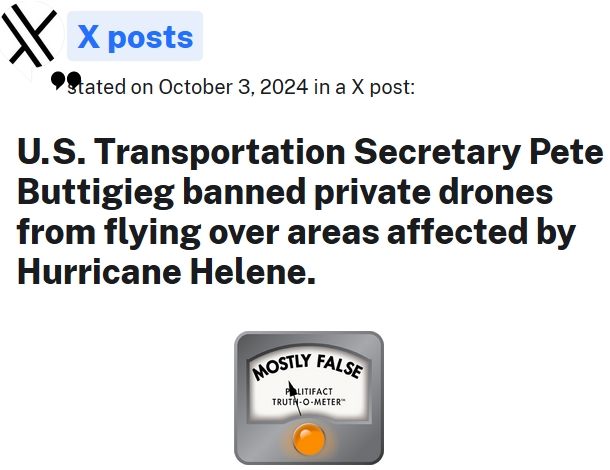 Another Oct. 3 X post said: "BREAKING: Pete Buttigieg announces private drones are RESTRICTED from flying over hurricane areas. This prevents civilian volunteers from locating victims in need or showing footage of the disaster."
