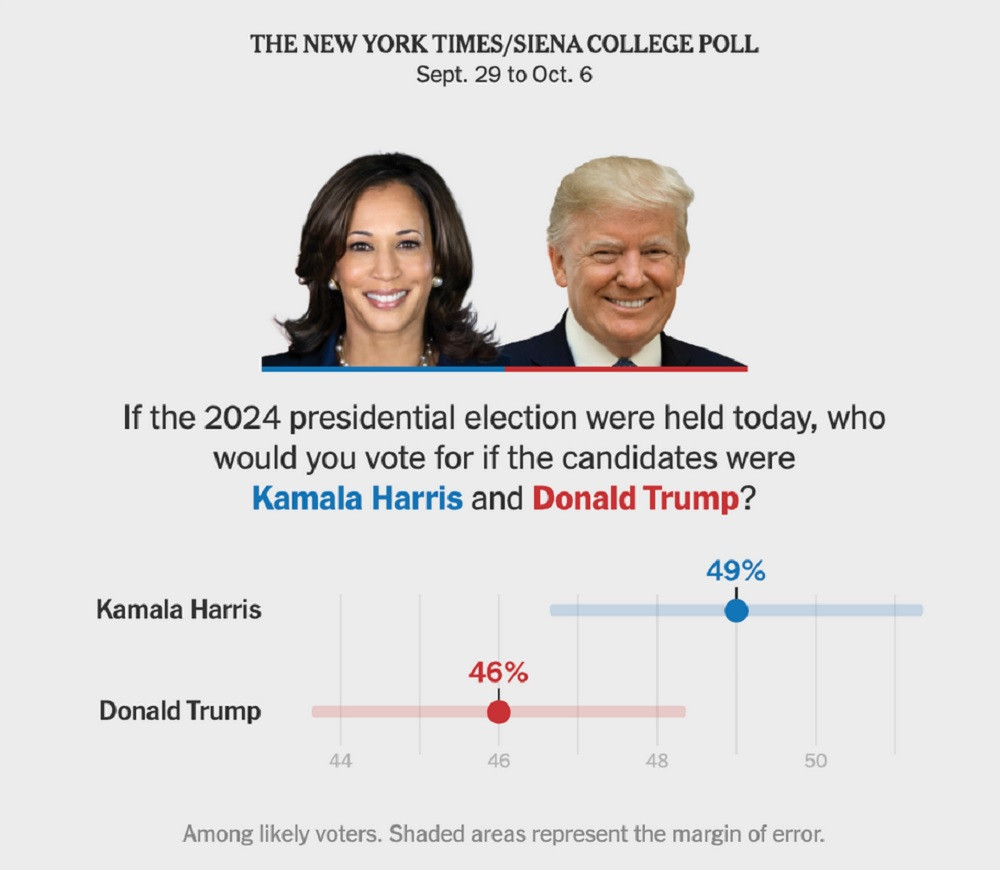 Tỷ lệ ủng hộ trên toàn nước Mỹ của bà Harris cao hơn ông Trump trong cuộc khảo sát. Ảnh: Thời báo New York/Đại học Siena